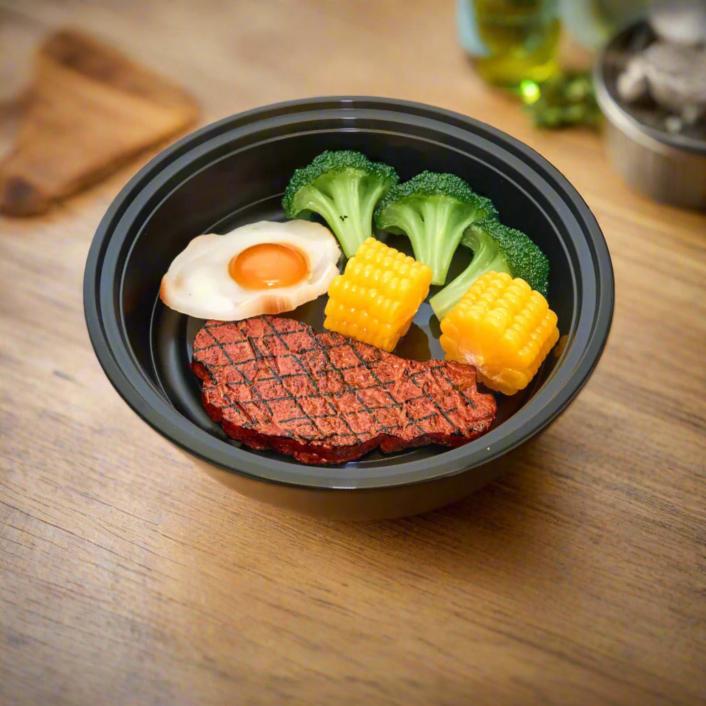 Versatile Black Round Bowls with secure clear lids ensure 100% food safety while preventing spills. These high-quality plastic containers are ideal for catering, takeout, and home use, perfect for serving or storing various portion sizes.